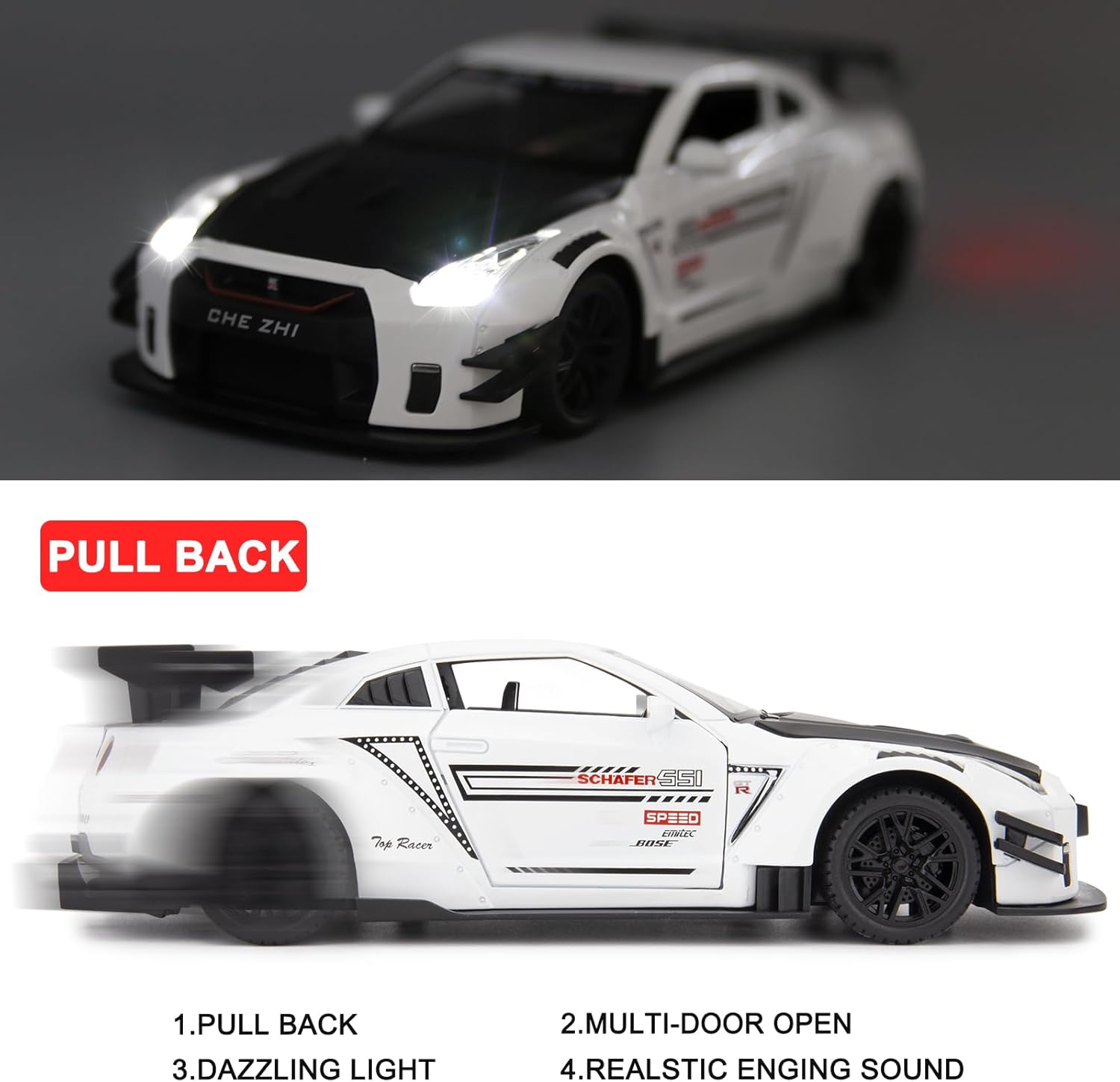 • 🏎️🎁 🏎️The car model has the powerful functions, which the Childhood, tail and the doors can be opened. Also have the pull back function, you can pull back the car and then it will driving with strong Power. The simulation of the car makes the car look beautiful and cool!. Made of high quality zinc alloy material, Full metal body car which makes it very difficult to be damaged. Non-toxic water-based paint spray and doesn’t contain formaldehyde and any other harmful substances. Not easy to Wreck and scratches with the delicate touch. 🏎️🎁🏎️