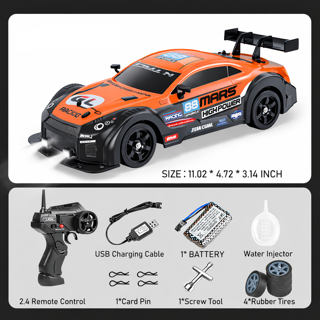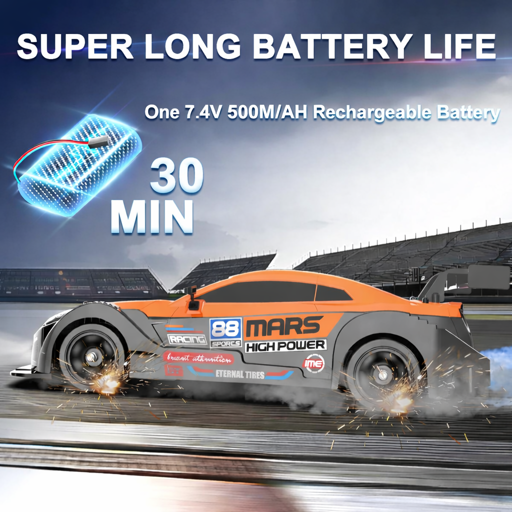 Replaceable Drifting and Racing Tires: The vehicle is equipped with two sets of tires to choose, racing tires and drifting tires, which can be interchanged as needed to adapt to different ground conditions and driving modes.